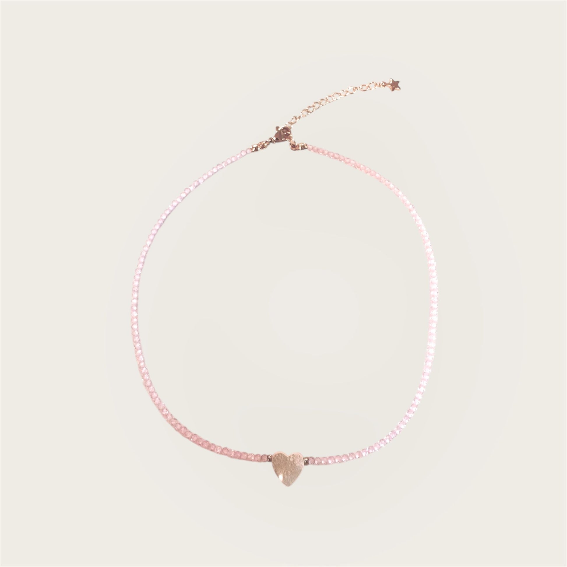 Hand-strung with shimmering faceted crystals (2mm), this piece features a luminous heart carved from natural mother-of-pearl, framed by subtle crystals and finished in radiant 18K gold plating.